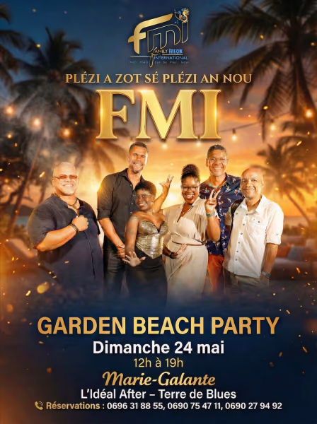 FMIFamily Mizik InternationalL’élégance du live, venue de Martinique s invite à Marie-Galante L Idéal After Terre de BluesDimanche 24 maiGBP – Garden Beach PartyMidi → 19hBoulevard de la Caraibe, Grand-Bourg(en direction de la plage)0696 31 88 550690 75 47 110690 27 94 92Une ambiance à vivre. Pas à raconter.*PLÉZI A ZOT SÉ A ZOT SÉ PLÉZI AN* !