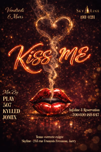 KISS ME – L’événement à ne pas manquer KISS ME – Vendredi 6 mars au SkylineAux platines : Play x 507 x Kylled X Jomix .Vous préparent un voyage sonore intense pour vous faire vibrer la piste jusqu’au bout de la nuit.Dress code : Tenue correcte exigéeSoyez élégants, séduisants, irrésistibles… Ce soir, chaque détail compte.Infoline & Réservations : 0690 188 647Spécial Ladies : Pour vous, mesdames, une coupe de champagne est offerte jusqu’à 22h00. Arrivez tôt pour trinquer avec nous !