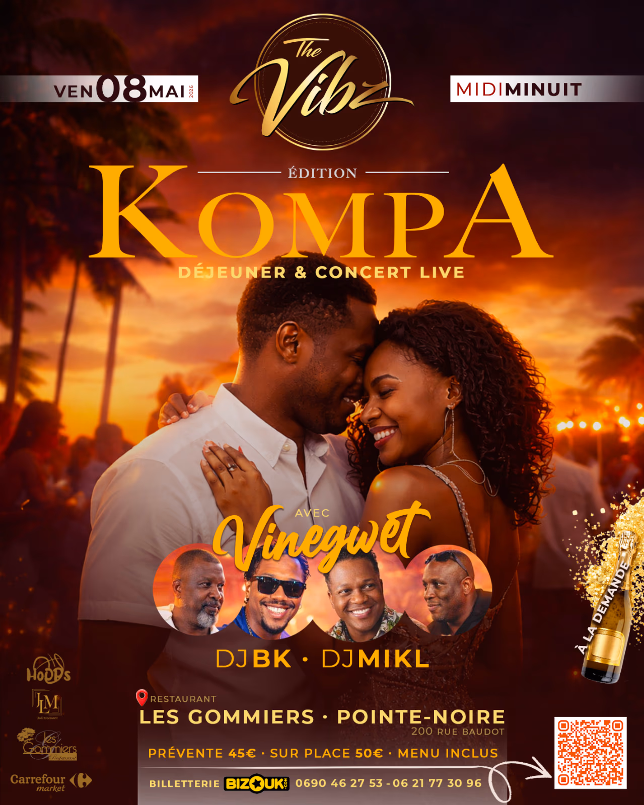 THE VIBZ organisation vous invite pour ça première édition "KOMPAS" - Déjeuner concert Live Cet événement haut en couleur se déroulera le vendredi 08 mai 2026 / Midi-Minuit Au restaurant "Les GOMMIERS" Rue Baudot 97116 POINTE-NOIRE Le Menu qui viendra éblouir vos papilles; Apéritif : Boissons : ti punch, planteur ou jus Mise en bouche Entrée : Salade composée Aubergine farcie Tarte fine poireaux saumon Plat chaud : Poisson grillée sauce créole et Tranche d'agneau grillé sauce poivre Riz pois coco rosés Gratin de giromon Dessert : Crumble pomme noisette chocolat et boule de glace vanille Eau plate et Vin rouge ====================================== Le groupe VINEGWET viendra enflammé la piste pour un concert Live avec Pascal et Stan et leurs Team de choc! DJ MKL et DJ BK prendront la suite aux platines!! Préparer vous à vivre une expérience unique où musique, ambiance et plaisir se rencontrent... Ambiance garantie de début à la fin ! De nombreuses petites attentions pour les 50 premiers billets achetés. Espace photo sur place pour capturer vos plus beaux moments. Venez passer un après-midi exceptionnel dans un cadre chaleureux, entouré d'une équipe prête à vous faire vibrer. Good vibes / Musique live / Un moment INOUBLIABLE prévu pour vous!! 45 euros en prévente 50 euros sur place 20 euros enfants (- de 12 ans) INFOLINE et RÉSERVATION: 0690.46.27.53 / 06.21.77.30.96