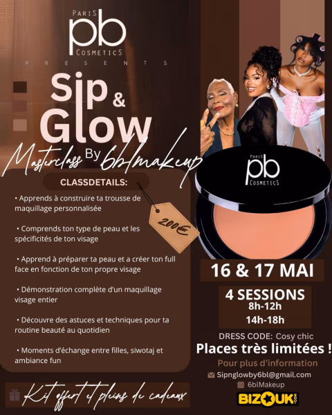 ✨ SIP & GLOW — Masterclass by 6blMakeup x Paris PB Cosmetics Tu veux enfin maîtriser ton maquillage, comprendre ta peau et repartir avec des techniques qui changent ta routine pour de bon ? Sip & Glow, c'est bien plus qu'une masterclass. C'est une expérience beauté immersive, dans une ambiance cosy chic, entre filles, avec du fun, des cadeaux et de vraies techniques pro. 🎓 Ce que tu vas apprendre : - Construire ta trousse de maquillage 100% personnalisée - Comprendre ton type de peau et les spécificités de ton visage - Préparer ta peau et créer un full face qui te ressemble vraiment - Assister à une démonstration complète d'un maquillage visage entier - Repartir avec des astuces et techniques pour ta routine beauté au quotidien 🗓️ Les 16 & 17 Mai — 4 sessions disponibles 🕗 Matin : 8h–12h | 🕑 Après-midi : 14h–18h 💸 Tarif : 200€ 👗 Dress code : Cosy chic 🎁 Kit offert + plein de cadeaux ⚠️ Places TRÈS limitées — réserve vite avant que ça parte ! 📩 [email protected] 📸 @6blMakeup