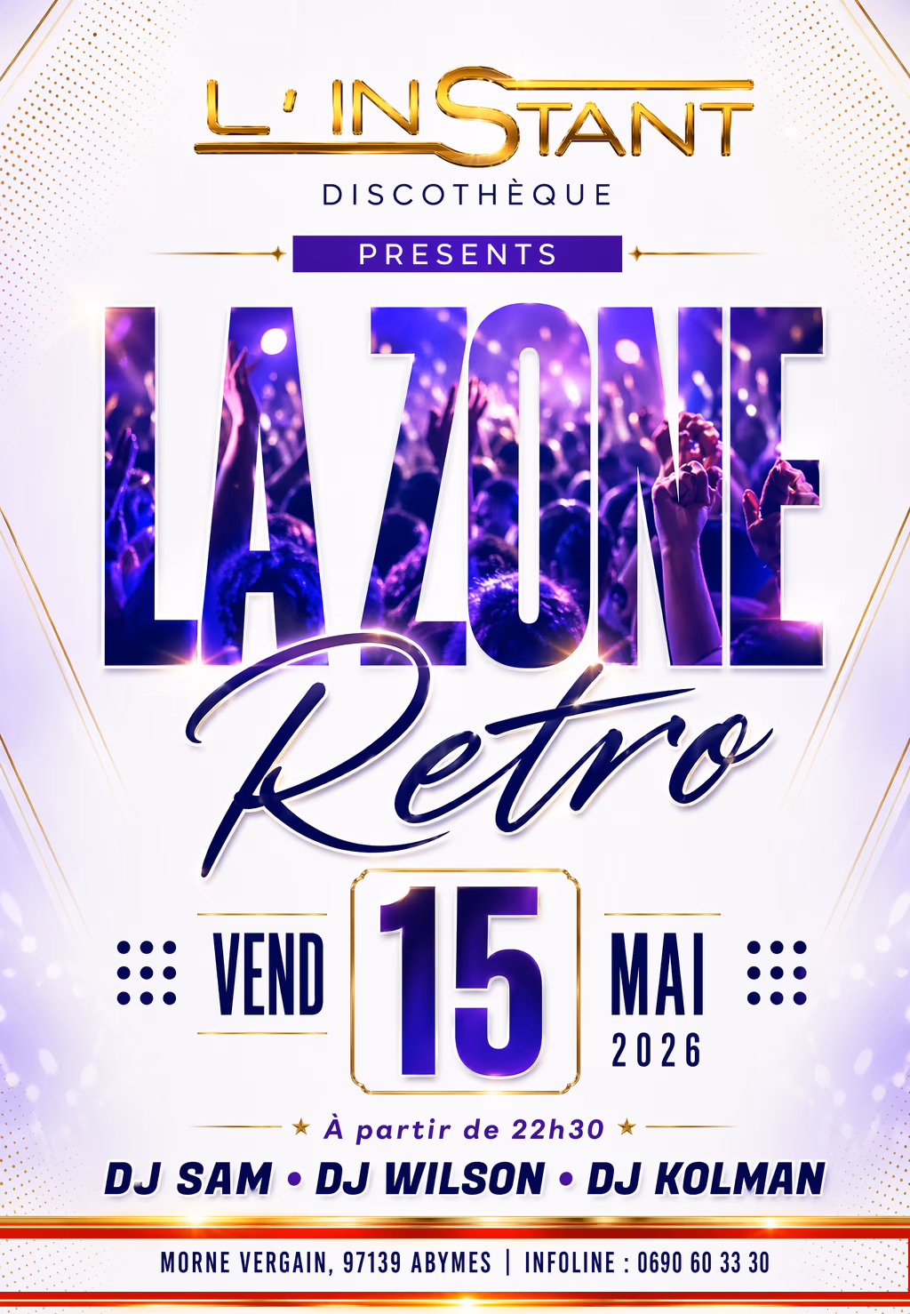 ✨ La Zone Rétro débarque à L’Instant Discothèque ! ✨ Prépare ton meilleur look rétro et viens faire la fête avec nous pour une soirée 100% ambiance, musique et good vibes ! 🕺💃🎶 📅 Vendredi 15 Mai 2026 🕥 À partir de 22h30 🎧 Aux platines : DJ SAM • DJ WILSON • DJ Kolman • 📍 Morne Vergain, 97139 Abymes 📞 Infoline : 0690 60 33 30 🔥 Sortez les lunettes, les paillettes et l’énergie rétro… la piste vous attend ! 🪩✨