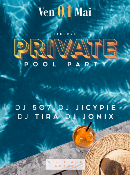 Les Private Pool Party sont de retour! Alors rdv le 1er mai 2026 dans une jolie Villa aux Abymes, de 14h à 22h.Vibrez au rythme de mix ensolleillés de nos talentueux DJs: 507, Jicypie, Tira, et Jonix.Profitez de tarifs attractifs avec une entrée à 20 € pour les hommes et 10 € pour les femmes. Vous pouvez aussi réserver packs et tables pour venir avec votre TEAM!N'oubliez pas votre maillot et préparez-vous à vous éclater sur les meilleures playlists de la saison !