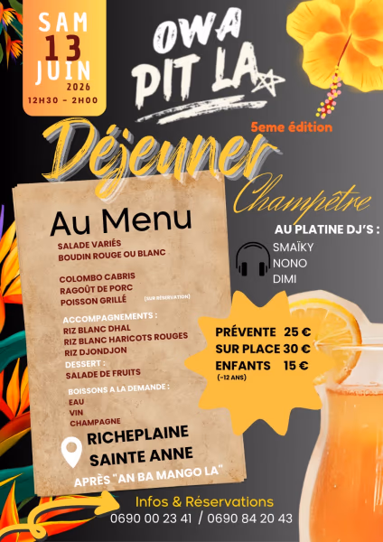 OWA PIT LA en champêtre pour notre 5eme édition on vous attend pour une superbe ambiance en famille le Samedi 13 juin dans un cadre agréable et festif 🎉🕺🏽 VENEZ PROFITER DE NOS BONS PLATS, NOTRE BONNE AMBIANCE, ET VOUS SEREZ ACCUEILLIS COMME IL SE DOIT AFIN DE PASSER UN BON MOMENT DE PARTAGE ET D'AMBIANCE AVEC NOS DIFFÉRENTS Djs qui mettront le feu !!! 🔥🔥N'HÉSITEZ PAS À VENIR AVEC CEUX QUI VOUS SONT CHERS CAR L'AMBIANCE SERA AU RENDEZ-VOUS !!!ESPRIT CORRECT EXIGÉPAS DE BIJOUX PS: nombre de ticket limitéPour plus de détails n'hésitez pas à nous contactez :Sarah :0690842043 Rammou: 0690002341