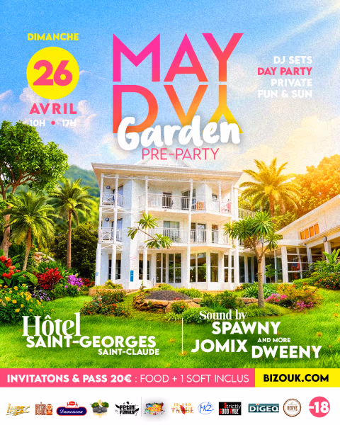 Il y a des dimanches qui s’organisent, et d’autres qui se vivent 🔥.Le dimanche 26 avril, on se retrouve avec dj Spawny, dj Jomix, dj Dweeny and more pour profiter d’une ambiance de folie qui va te faire oublier ta semaine 🫨.Un seul mot d’ordre : tu danses sans réfléchir, tu retrouves tes potes et tu rigoles sans modération de 10h à 17h 🥳.MAYDAY Garden, c’est notre deuxième pré party et elle sera encore plus incroyable 🌴🔥!📍Hotel Saint-Georges à Saint-ClaudeÉvénement interdit au moins de 18 ans. Tenue correcte exigée.
