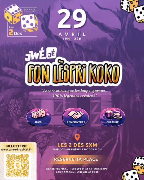 Ta soirée Jwéjé Fon Lèspri Koko débarque à St-Martin !Retrouve ton équipe Carré Tropical le 29 avril de 19h à 22h chez Les 2 Dés : le premier espace entièrement dédié aux jeux à Saint-Martin ! L’endroit idéal pour des moments amusants en famille ou entre amis au bord de l’eau. Viens participer à une soirée jeux amusante et découvrir ta culture avec Fon Lèspri Koko, ton jeux 100% légendes créoles.Plus d'infos sur carré-tropical.fr