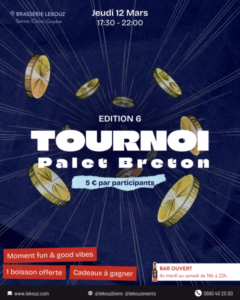 Jeudi 12 mars | 17h30 – 22h00 Sainte-Claire, Goyave La compétition revient pour une 6ᵉ édition pleine d’énergie ! Rejoignez-nous pour notre Tournoi de Palet Breton et tentez votre chance dans une ambiance fun & good vibes 5€ par participant 1 boisson offerte Cadeaux à gagner Que vous soyez stratège confirmé ou joueur du dimanche, venez relever le défi et partager un moment convivial autour d’une bonne bière artisanale.