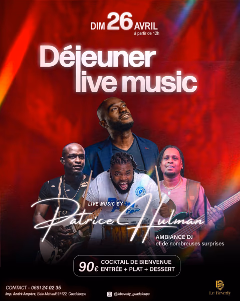 Rejoignez-nous pour un délicieux déjeuner musical au cœur de la Guadeloupe au sein de l'élégant cadre du Beverly. Ce 26 avril à partir de midi, vivez une expérience inoubliable en compagnie de Patrice Hulman, dont la performance live marquera votre journée avec ses sons entraînants. Profitez d'un cocktail de bienvenue suivi d'un menu complet pour seulement 90€, comprenant entrée, plat et dessert. Laissez-vous emporter par l'ambiance DJ dynamique et de nombreuses surprises à découvrir. Ne manquez pas cette fusion unique de gastronomie et de musique live organisée par Le Beverly. Assurez-vous de réserver votre place pour vivre une journée remplie de bonne musique et de délicieux mets en bonne compagnie. À très bientôt pour une journée que vous n'oublierez pas de sitôt!