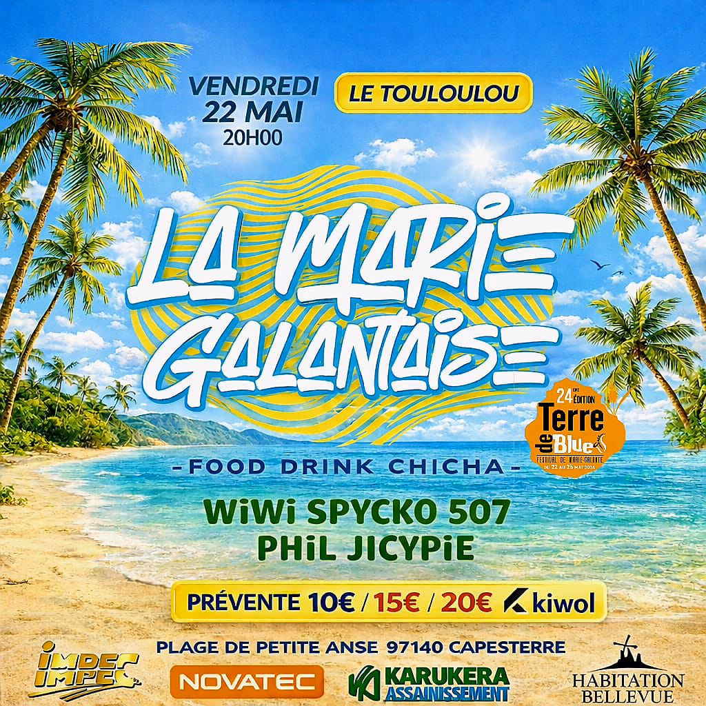 🌴 LA MARIE-GALANTAISE 🌴 🗓️ Vendredi 22 Mai 2026 – 20H 📍 Le Touloulou 🏖️ Plage • 🌺 Vibe Caribbean • 🍢 Food • 🍹 Drink • 💨 Chicha 🔥 LINE-UP EXPLOSIF 🔥 Wiwi – 507 – Dankers – Spycko – Jicypie – Phil 🎶 Du son pour t’ambiancer jusqu’au bout de la nuit ! 🎽 DRESS CODE ? ❌ Tenue correcte INTERDITE ✅ Tenue plage CONSEILLÉE 👒🩳🕶️👗🩱🌞 Shorts, robes légères, chemises ouvertes, tongs… Ambiance pieds dans le sable, tête dans les étoiles ✨ ✨ PLUS D’ESPACE – PLUS DE TABLES – PLUS DE CONFORT 💸 TARIFS • 🎟️ Early Bird : 10€ (⚠️ Quantité limitée) • 🎫 Prévente : 15€ • 🎫 Sur place : 20€ 🕗 OUVERTURE DES PORTES : 20H Et on s’arrête quand t’es KO 😴💃🏽🕺🏽 ☎️ INFOLINE & RÉSA 📞 0690 403 663 📞 0690 702 238 🎟️ Préventes disponibles dès maintenant ! Ramène-toi, ramène ta vibe… Ça va être CHAUD BOUILLANT 🔥🌊☀️🥳 #MarieGalantaise #TouloulouVibes #SoiréePlage #OnDortPas