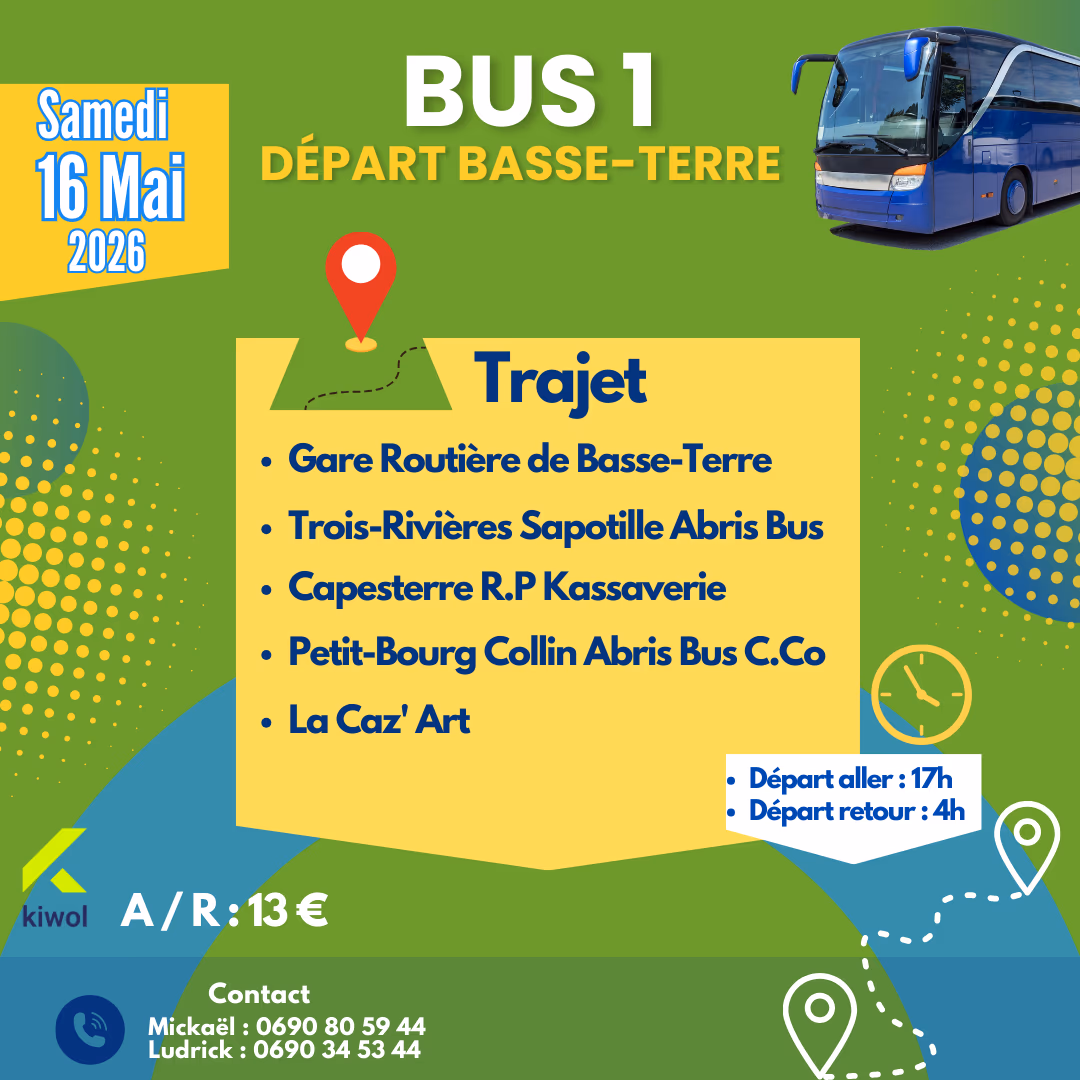 🚍 BUS 1 – Basse-Terre Voyagez en toute tranquillité depuis Basse-Terre et ses environs pour assister à l’événement à LaCaz’Art ✨ 📍 Trajet : • Gare Routière de Basse-Terre • Trois-Rivières – Sapotille (abris bus) • Capesterre – R.P Kassaverie • Petit-Bourg – Collin (abris bus C.Co) • LaCaz’Art 🕒 Horaires : • Départ aller : 17h • Départ retour : 4h 💰 Tarif : 13€ aller / retour