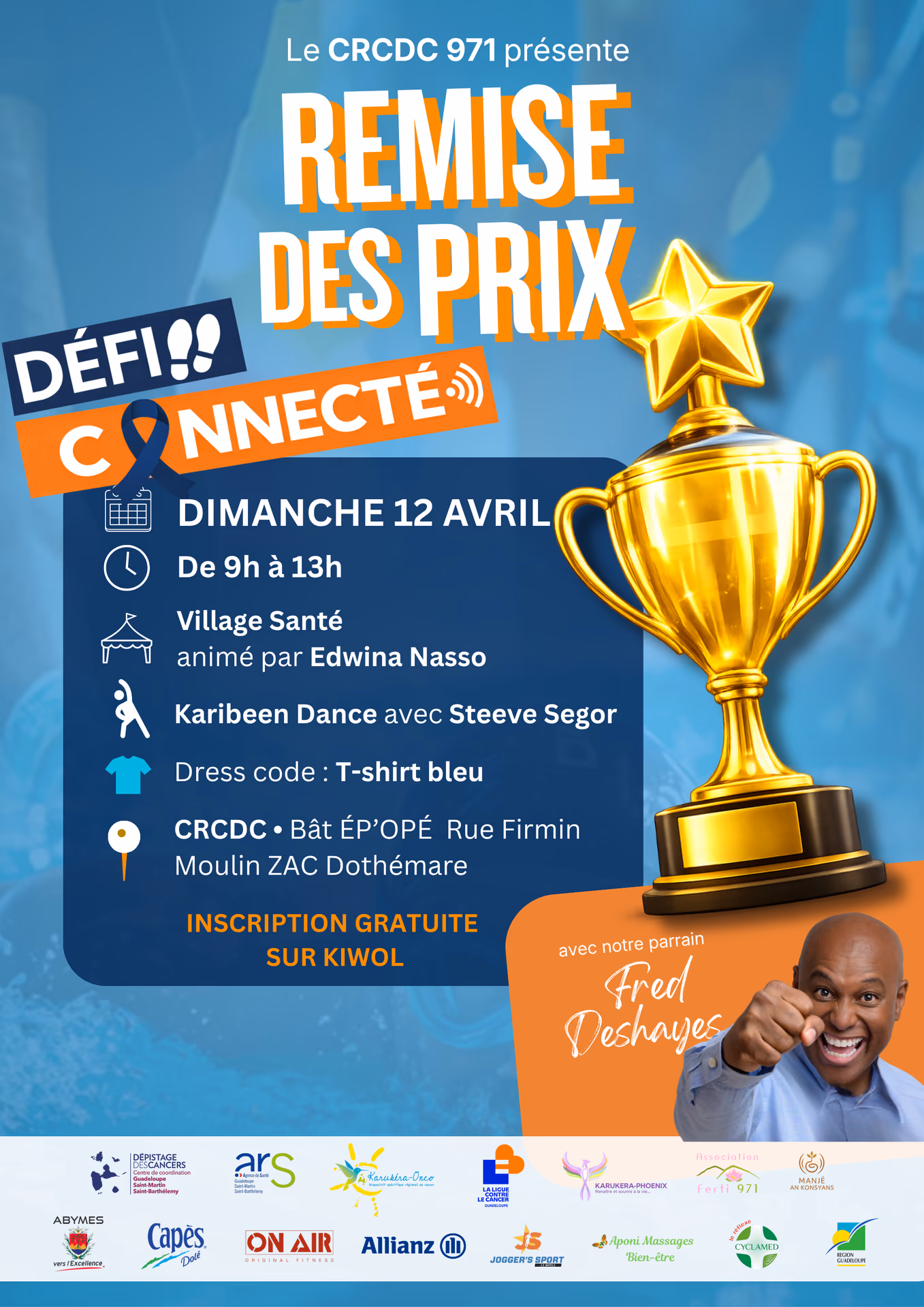 Après plusieurs semaines de mobilisation, le Défi Connecté touche à sa fin. Venez clôturer Mars Bleu dans une ambiance dynamique et engagée ! 🏆 Au programme : • Village Santé et Colon Tour • Animations autour de la prévention pour le dépistage du cancer colorectal • Session Karibeen Dance avec Steeve Segor ( Pensez à vous hydrater ! ) • Remise des récompenses du défi En présence de notre parrain, Fred Deshayes ! Rendez-vous 📅 Dimanche 12 avril 2026 🕘 de 9h à 13h 📍 au CRCDC – Rue Firmin Moulin, Bât EP’OPÉ, ZAC Dothémare En T-SHIRT BLEU et en forme !