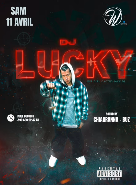 Samedi 11 avril au W club dès 22hDJ LUCKY (official cactus jack DJ) posera ses platines au W club pour une soirée d’anthologieAccompagné de Chiarranna tout droit sortit de Paris, ainsi que Buz dj résident du W club, pour vous faire danser toute la soiréeVenez vivre l’expérience d’une soirée où la hype et la folie seront de pairs.Early bird 15€Preventes 20€Last minute 25€Reservation table via WhatsApp : +590690503559La direction de laisse le droit d’entrée.