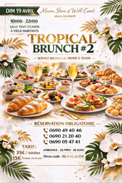 La Tropical Brunch fait son grand retour, avec son Acte 2 ! Vous l’attendiez… elle revient à la demande générale Nouveau Lieu Plus de saveur Plus de chaleur Plus de Fun *Prépare toi à retrouver le Brunch le plus *"Wouaar"* de la côte sous le vent Un max de musique, Une convivialité irréprochable Un service au plus près de vous*La Tropical Brunch#2 est vraiment de retour !*Rendez-vous à partir de 10h00 le *DIMANCHE 19 AVRIL 2026* À LA SALLE TRAIT D'UNION DE VIEUX-HABITANTS Tarif: 35€/Adultes - 15€ Enfants (4 à 11 ans)