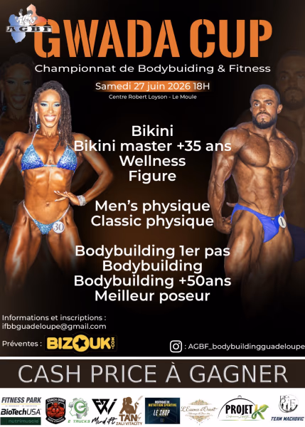 Championnat de Bodybuilding & Fitness — Guadeloupe : GWADA CUPVivez la soirée la plus puissante du fitness caribéen.Une fois par an, la Guadeloupe devient "la scène" où la discipline, le dépassement de soi et l’élégance sportive prennent vie.Sur scène : des athlètes de Guadeloupe, mais aussi de Métropole, Martinique, Guyane (et parfois au-delà), prêts à tout donner pour vous offrir un show intense, inspirant et spectaculaire.🔥 Au programme :- Des physiques d’exception, des poses millimétrées, une énergie incroyable- Une ambiance “arena” : musique, lumières, émotions, frissons garantis- Un moment unique pour "soutenir nos talents locaux" et célébrer la communauté fitnessQue vous soyez passionné(e) de sport, curieux(se), en famille ou entre amis : venez ressentir l’adrénaline, applaudir, crier, vibrer… et repartir inspiré(e).🎟️ Réservez votre place maintenant : les meilleures places partent vite.👉 Prenez votre ticket et venez encourager les athlètes !