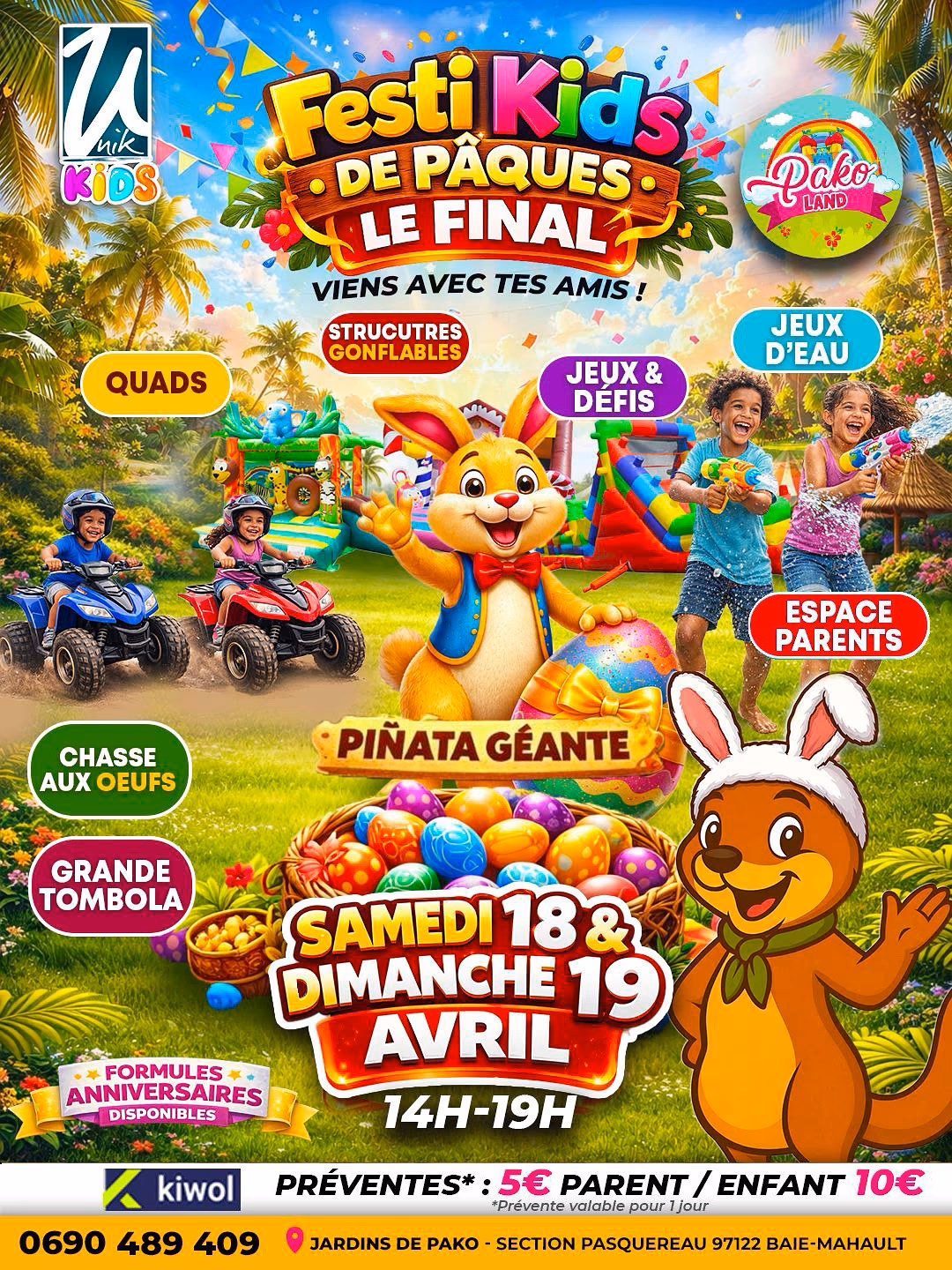 🎉🐣 PRÊTS POUR LE GRAND FINAL DE PÂQUES ?! 🐣🎉 Les samedi 18 & dimanche 19 avril de 14h à 19h, Pako Land vous donne rendez-vous pour le Festi Kids de Pâques – Le Final 😄 👉 Deux journées exceptionnelles pour clôturer les vacances en beauté, entre jeux, rires et animations 💥 Au programme : 🏎️ Quads 🎈 Structures gonflables 💦 Jeux d’eau 🎯 Jeux & défis 🥚 Chasse aux œufs 🎁 Piñata géante 🎟️ Grande tombola 🔥 Un week-end festif et dynamique, pensé pour faire plaisir aux enfants et créer de vrais moments de partage 👨👩👧👦 Espace parents prévu pour profiter du moment 📍 Jardins de Pako – Baie-Mahault 🎟️ Préventes (1 jour) : enfant 10 € / parent 5 € 📞 Contact : 0690 489 409 ✨ Pako Land, c’est le rendez-vous des vacances pour s’amuser, se retrouver et repartir avec de beaux souvenirs