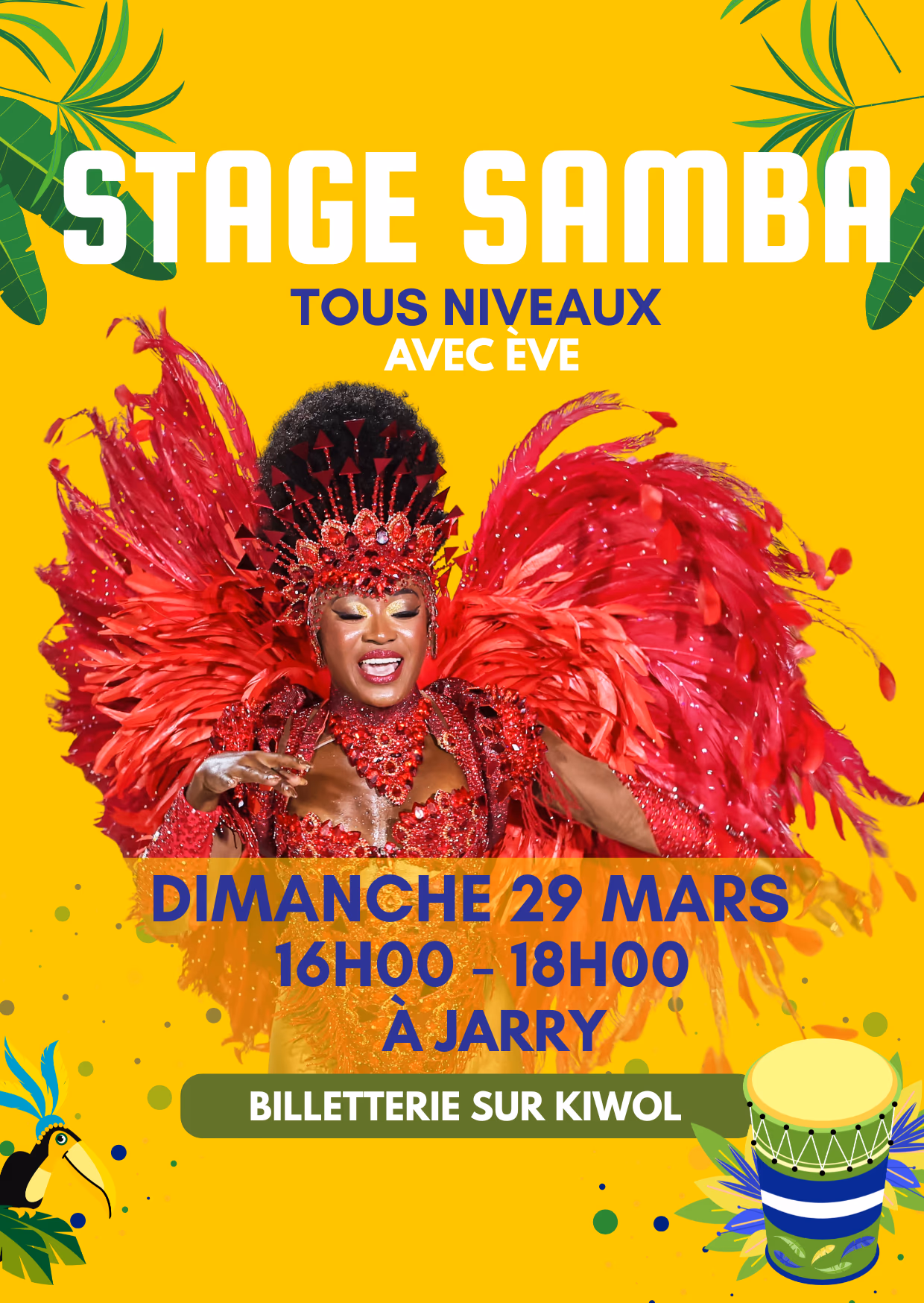 Stage de SAMBA du dimanche 29 mars 2026 16h00 - 18h00 : Tous niveaux (technique et chorégraphie) Lieu : école de danse Liliane Bimont, Jarry Informations : - Arriver 10 min avant le début su stage - Tenue de sport conseillée (legging, haut de sport, baskets propres ou chaussettes) - Apporter une bouteille d’eau et une serviette